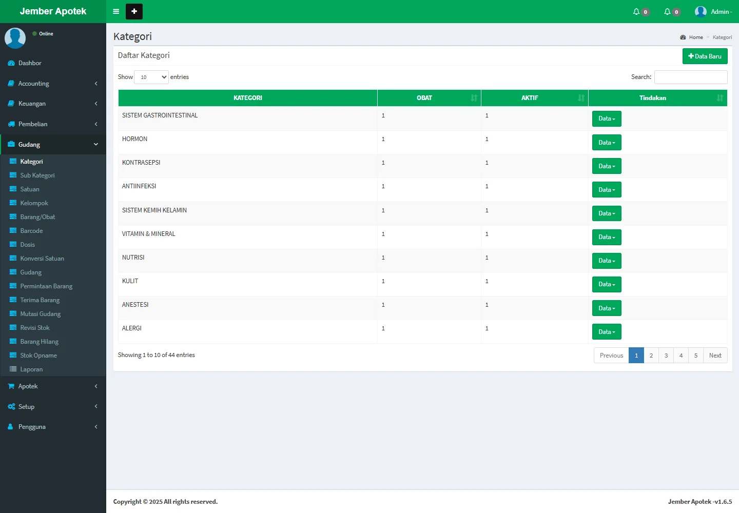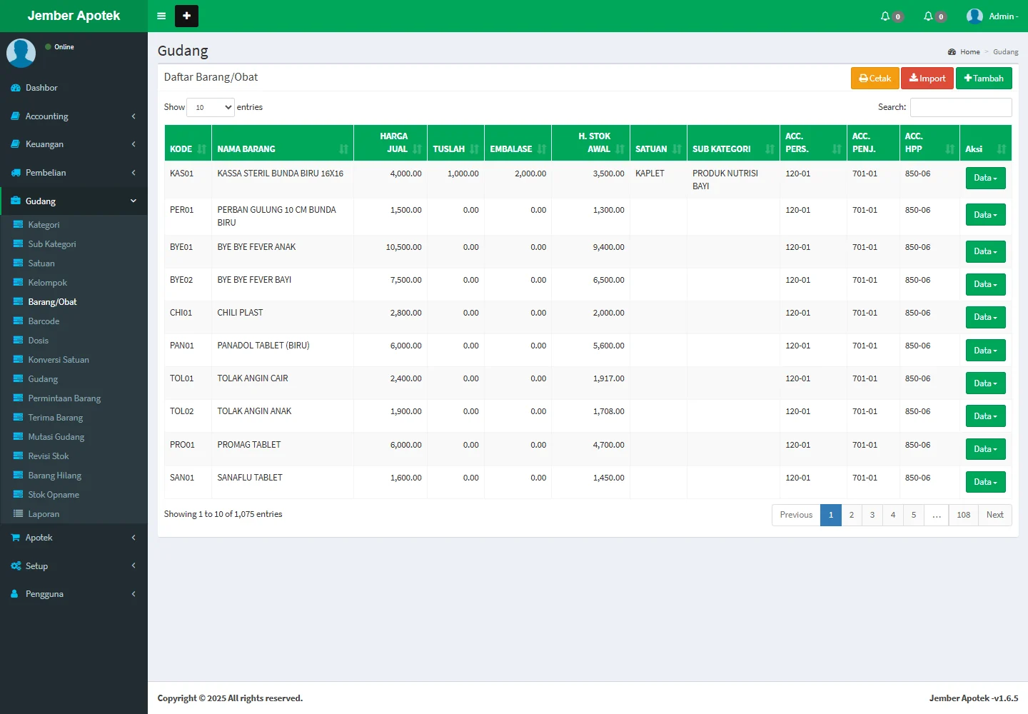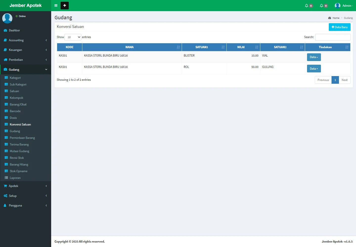 Atur data dasar barang/obat seperti kategori, dosis, barcode, satuan, serta konversi satuan untuk pengelolaan stok tepat.