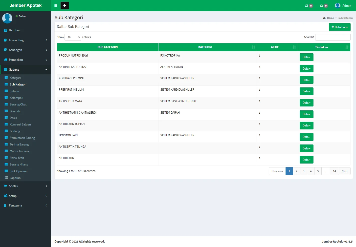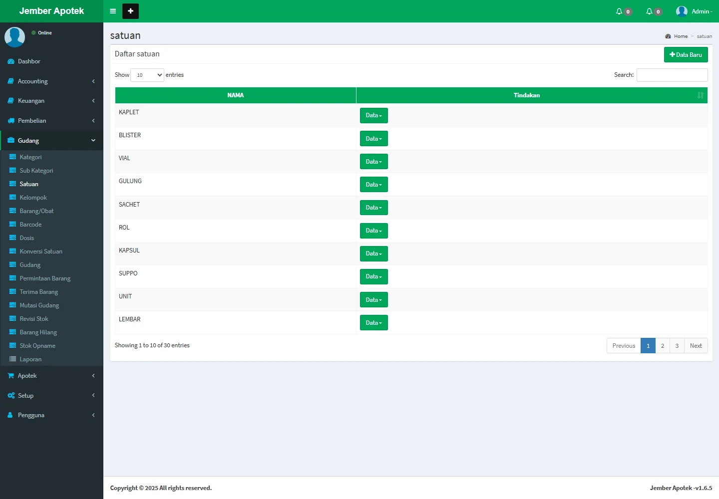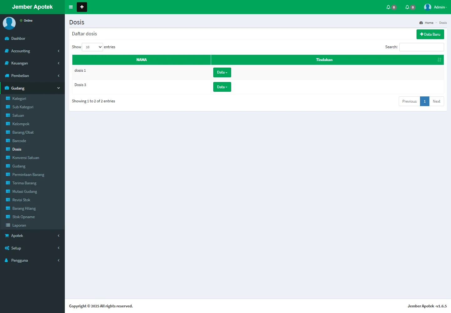 Atur data dasar barang/obat seperti kategori, dosis, barcode, satuan, serta konversi satuan untuk pengelolaan stok tepat.