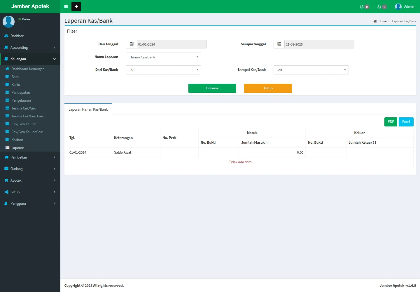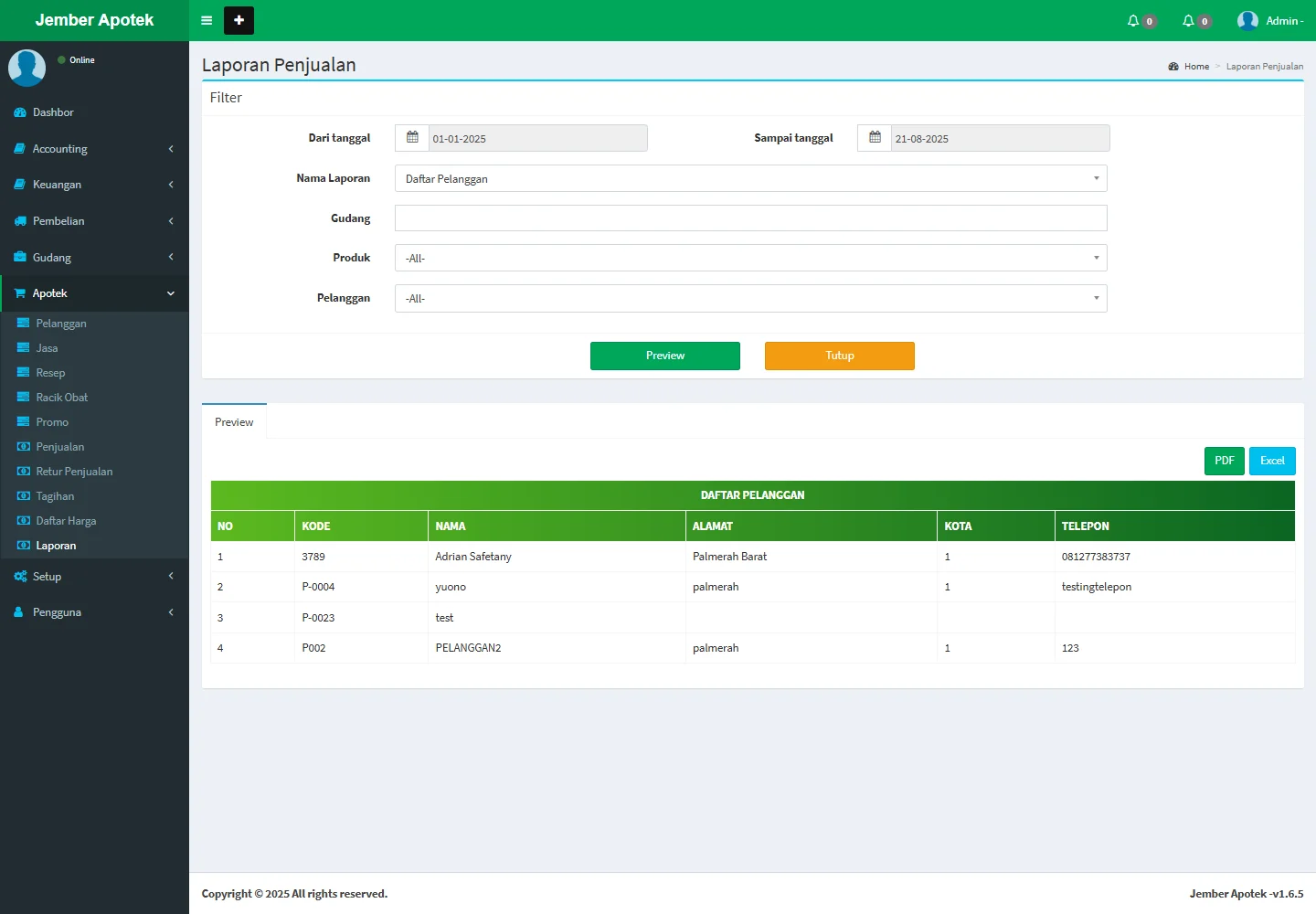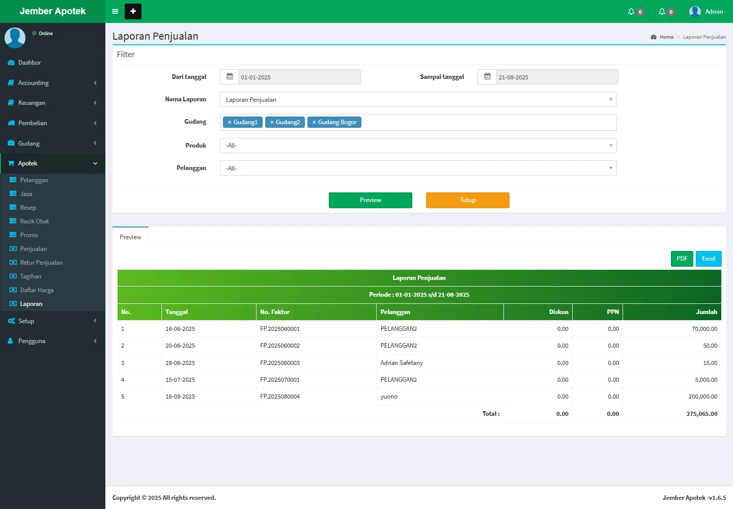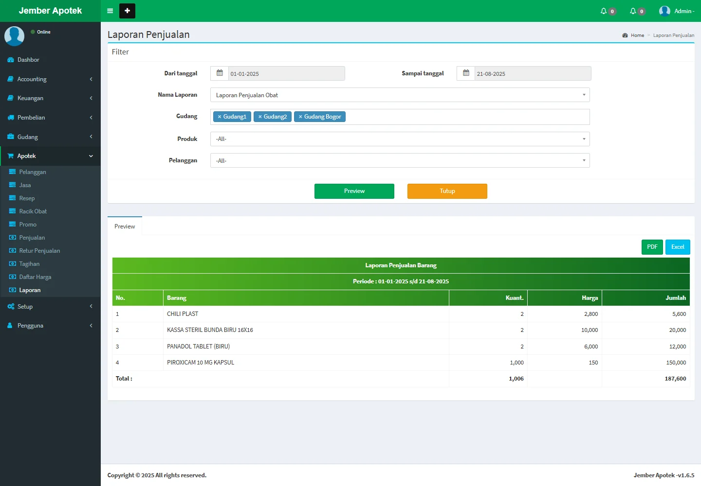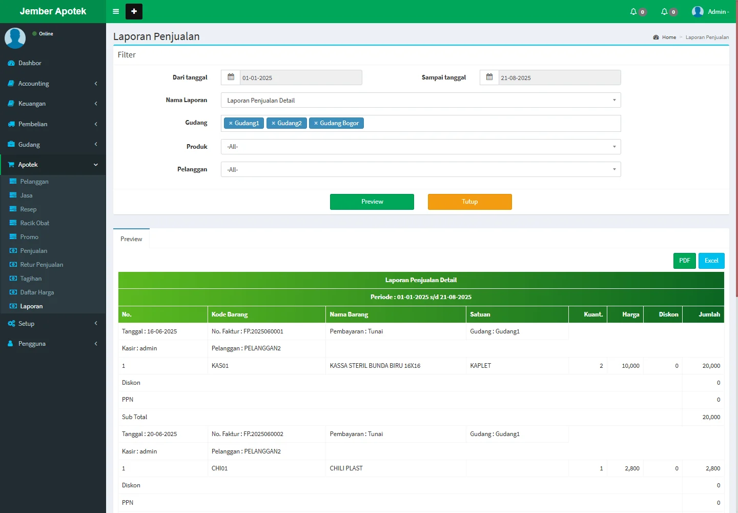 Menampilkan data seluruh pendapatan apotek secara detail, yang bisa diekspor ke PDF atau Excel.