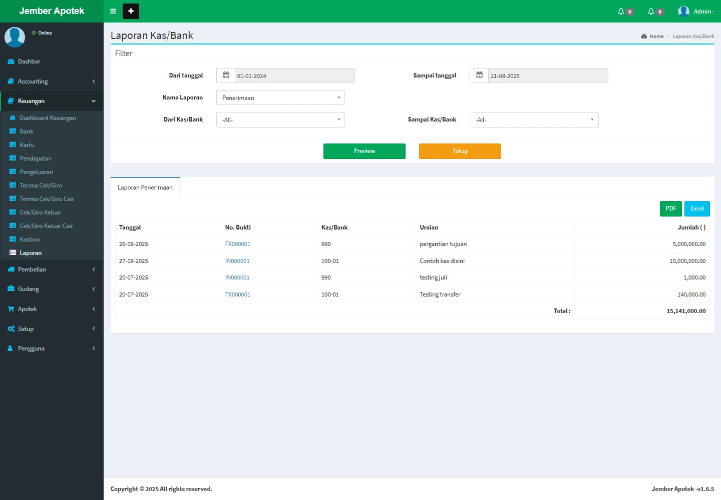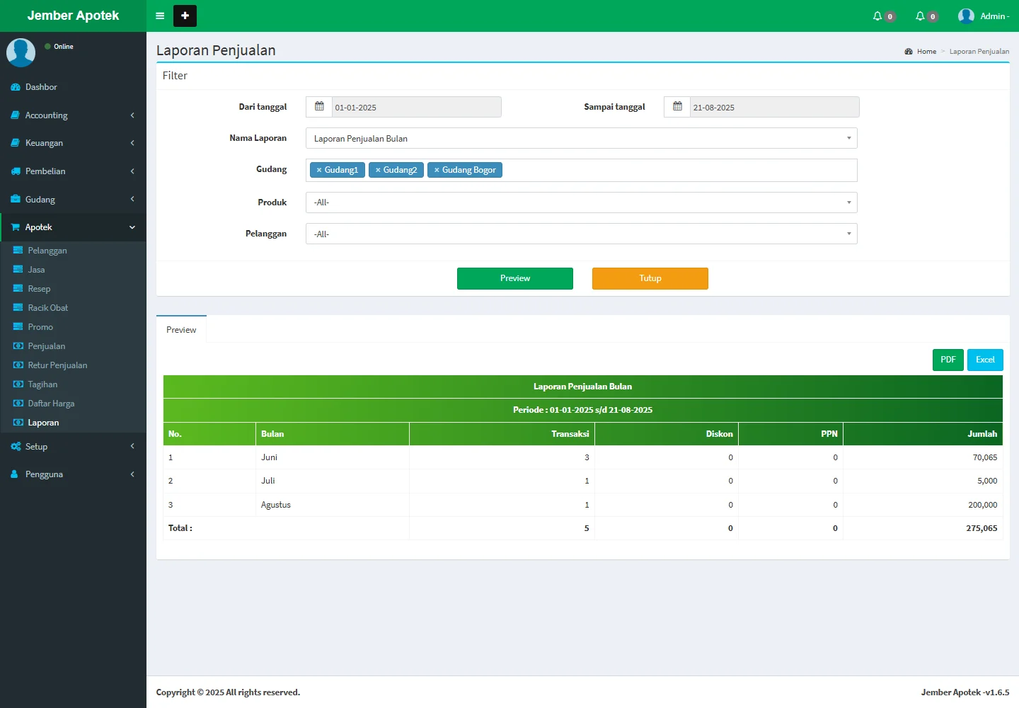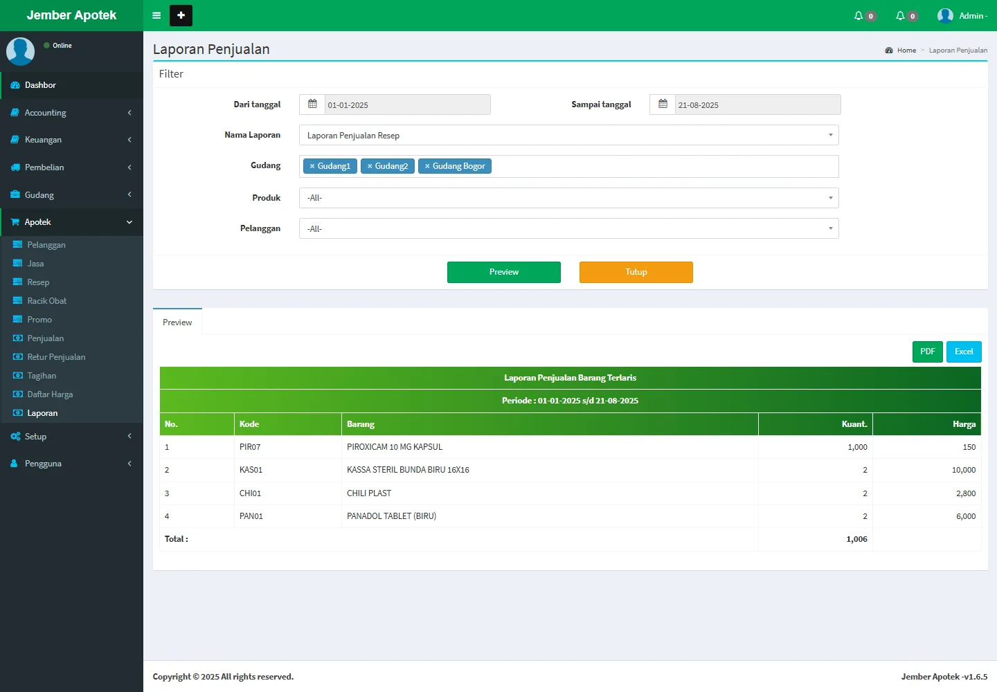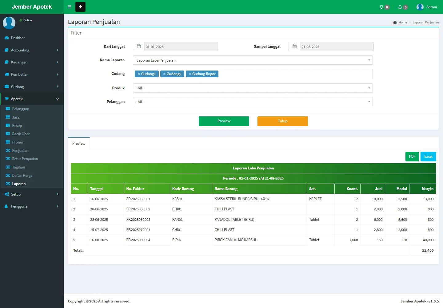 Menampilkan data seluruh pendapatan apotek secara detail, yang bisa diekspor ke PDF atau Excel.