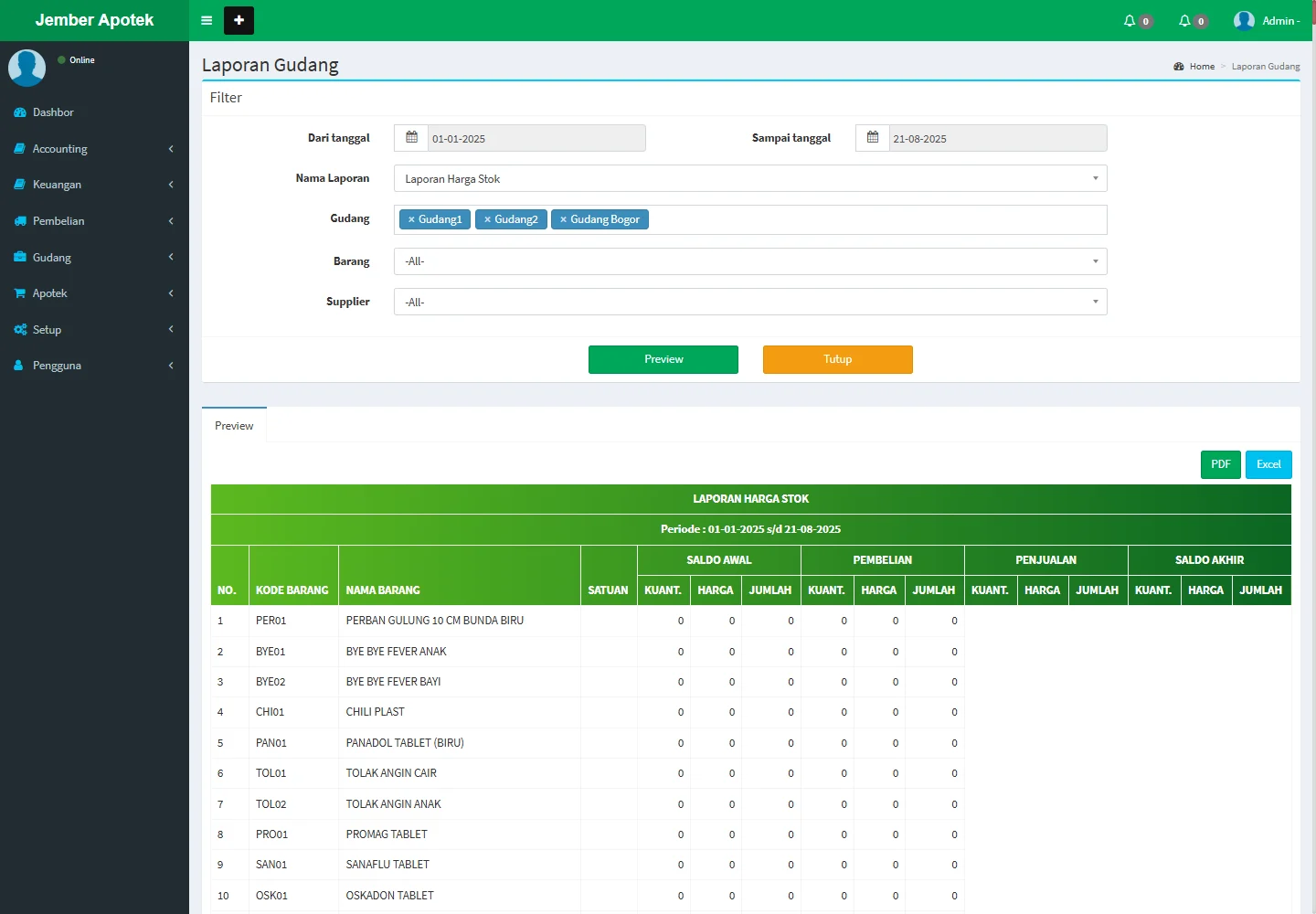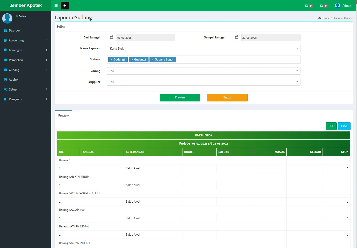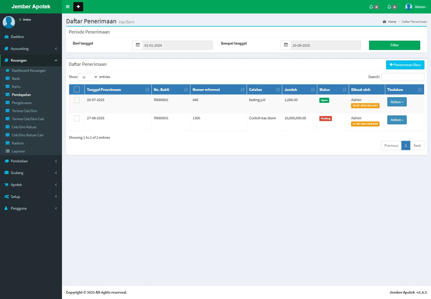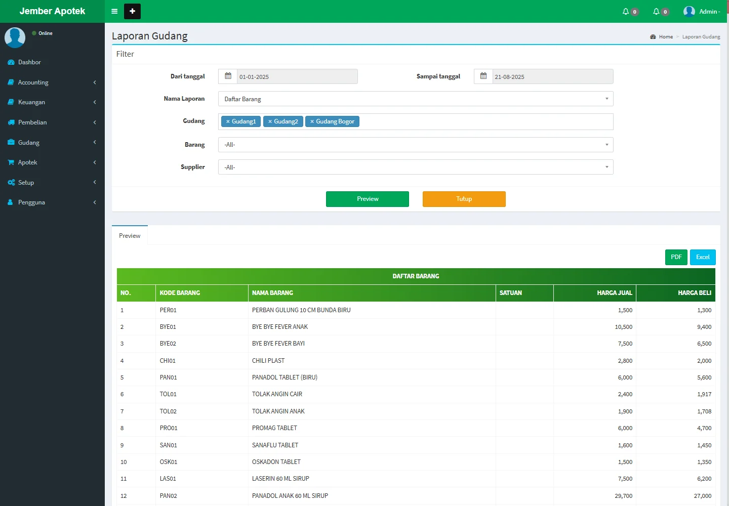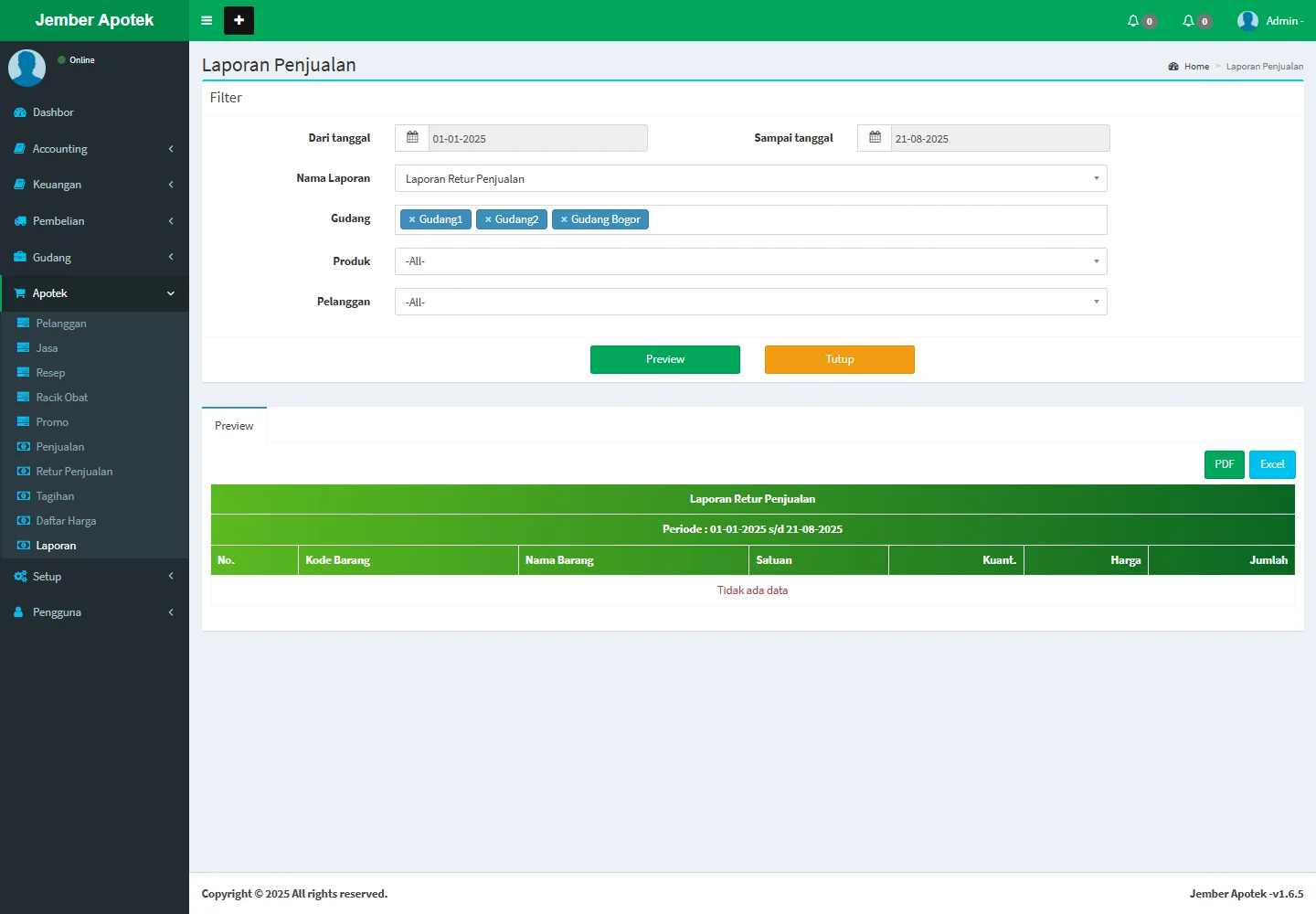 Menampilkan data seluruh pendapatan apotek secara detail, yang bisa diekspor ke PDF atau Excel.