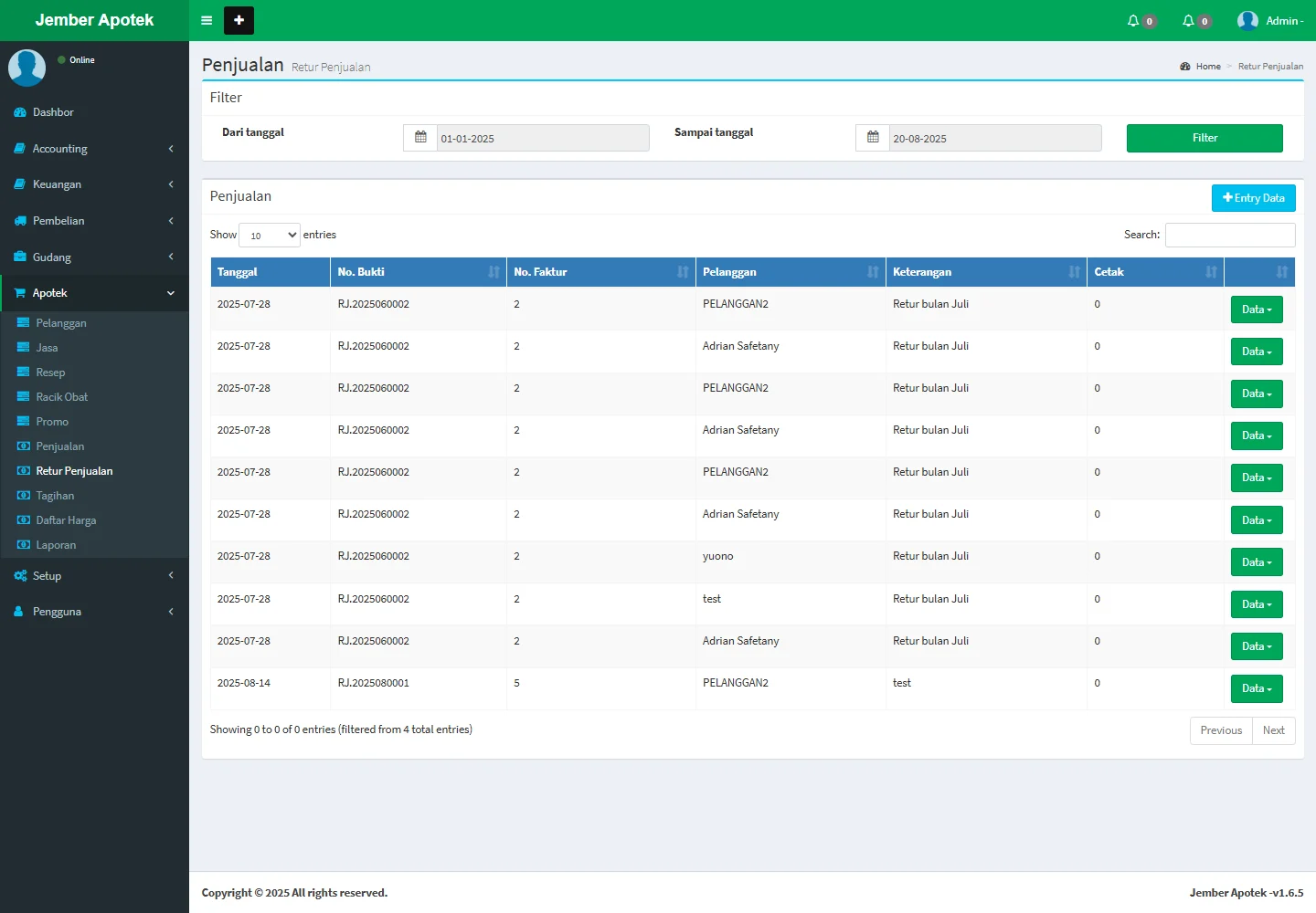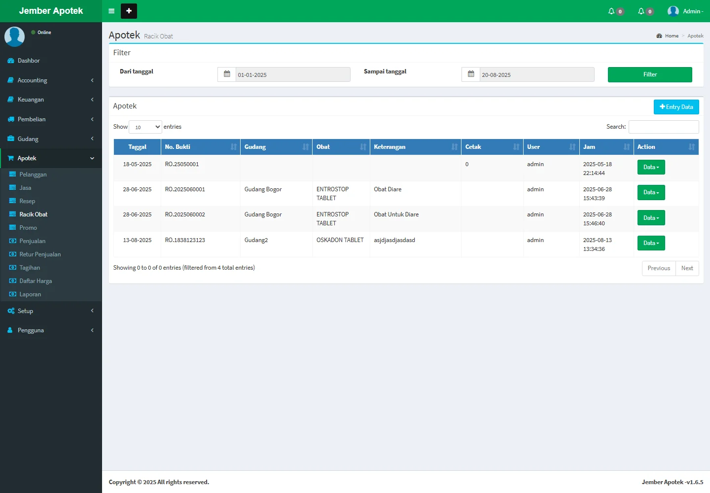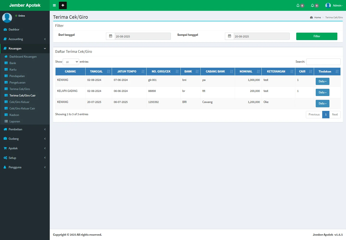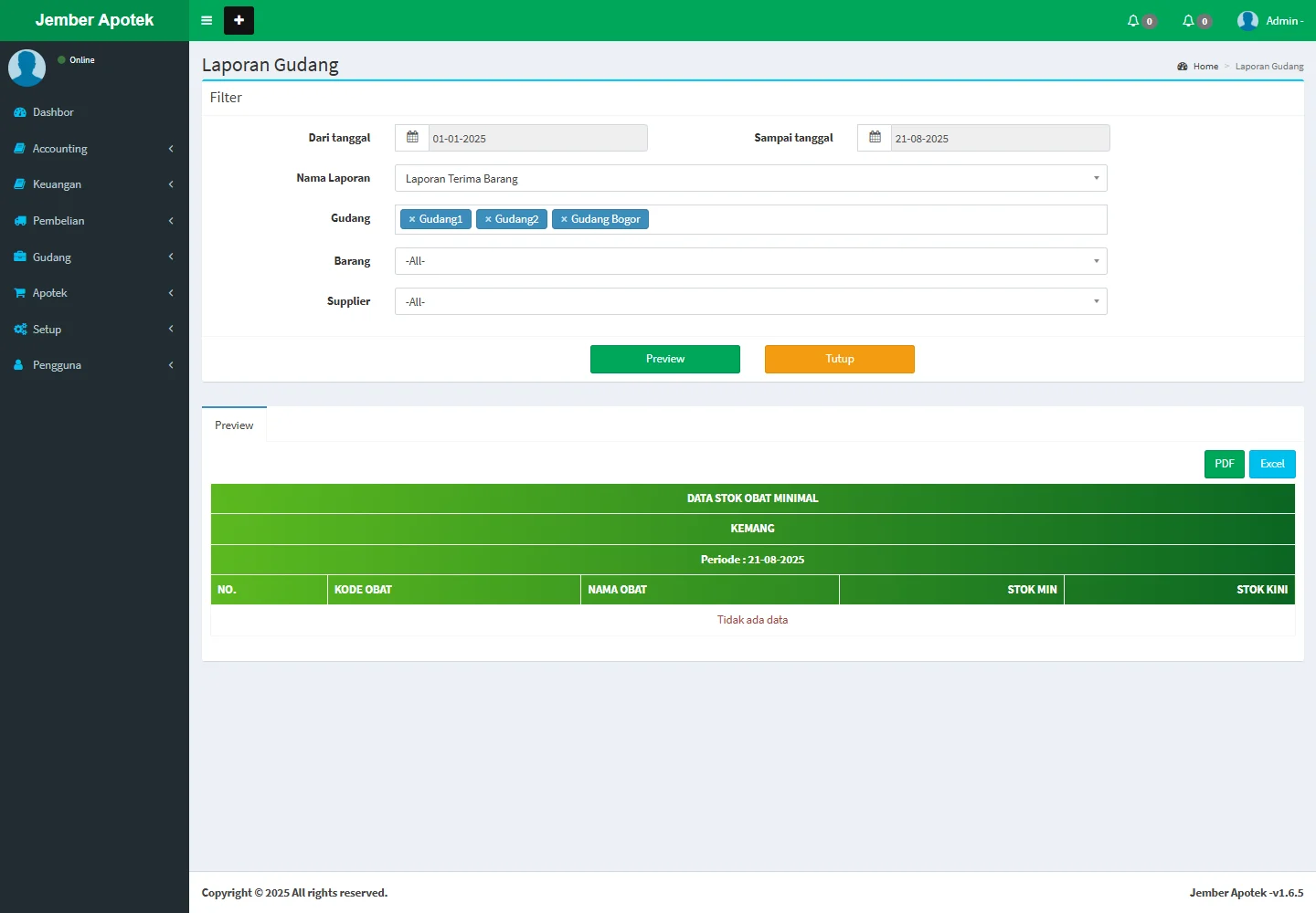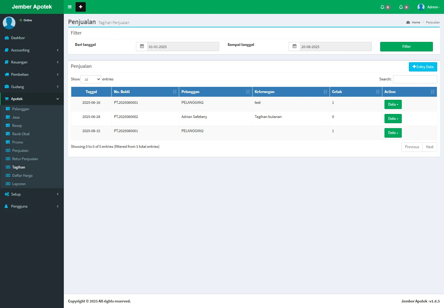Menampilkan data seluruh pendapatan apotek secara detail, yang bisa diekspor ke PDF atau Excel.