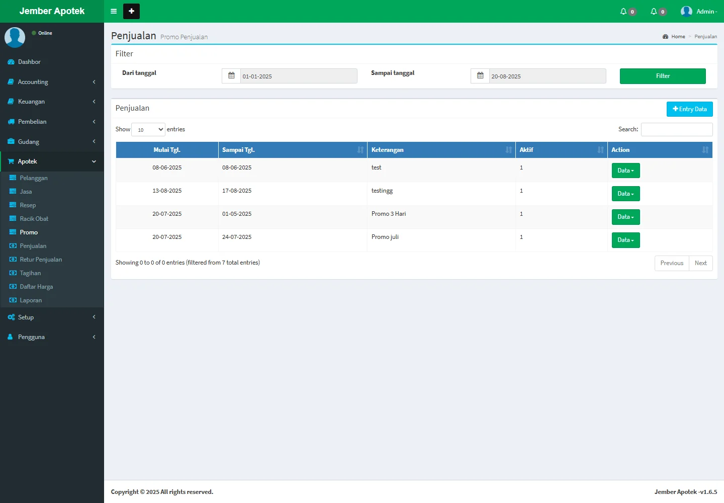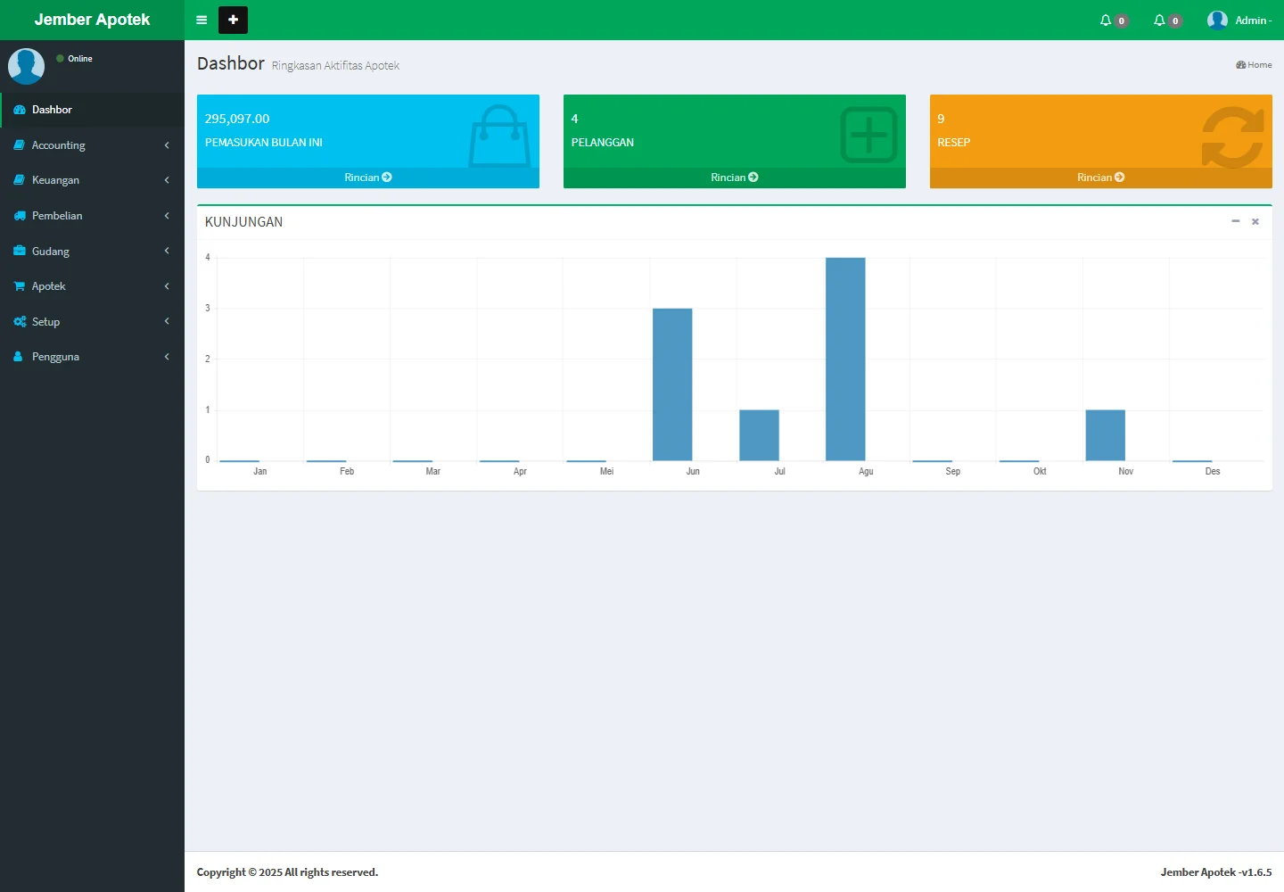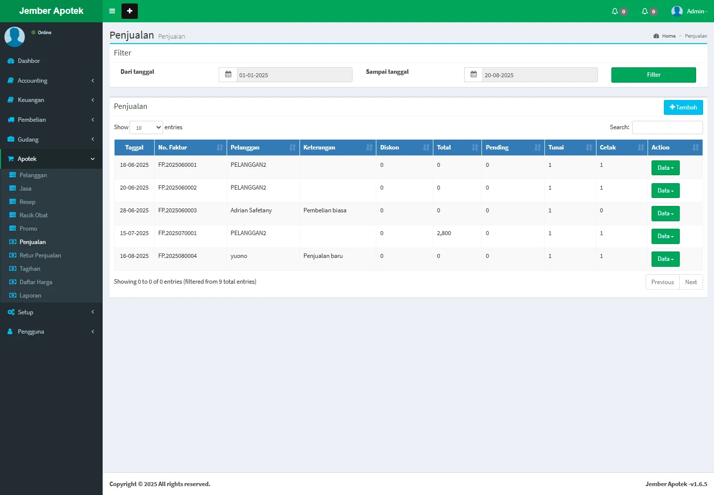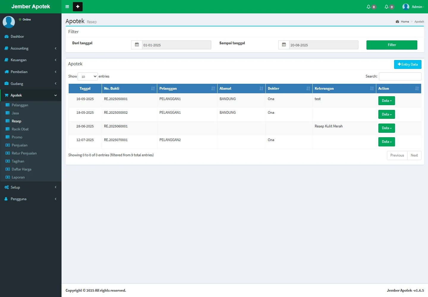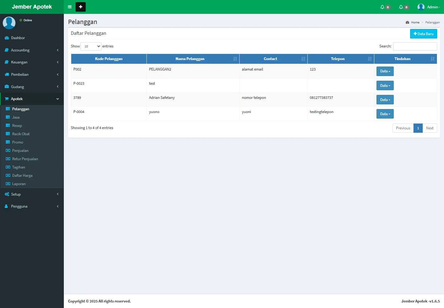 Fitur lengkap untuk pengelolaan pelanggan, resep, racik obat, promosi, penjualan, tagihan, dan laporan.