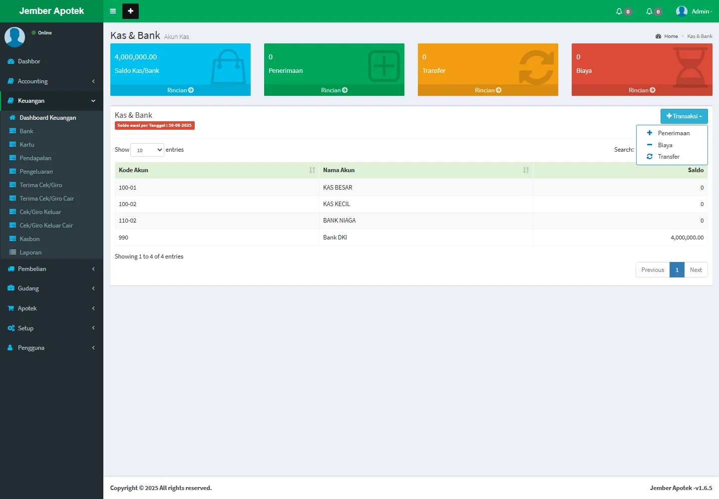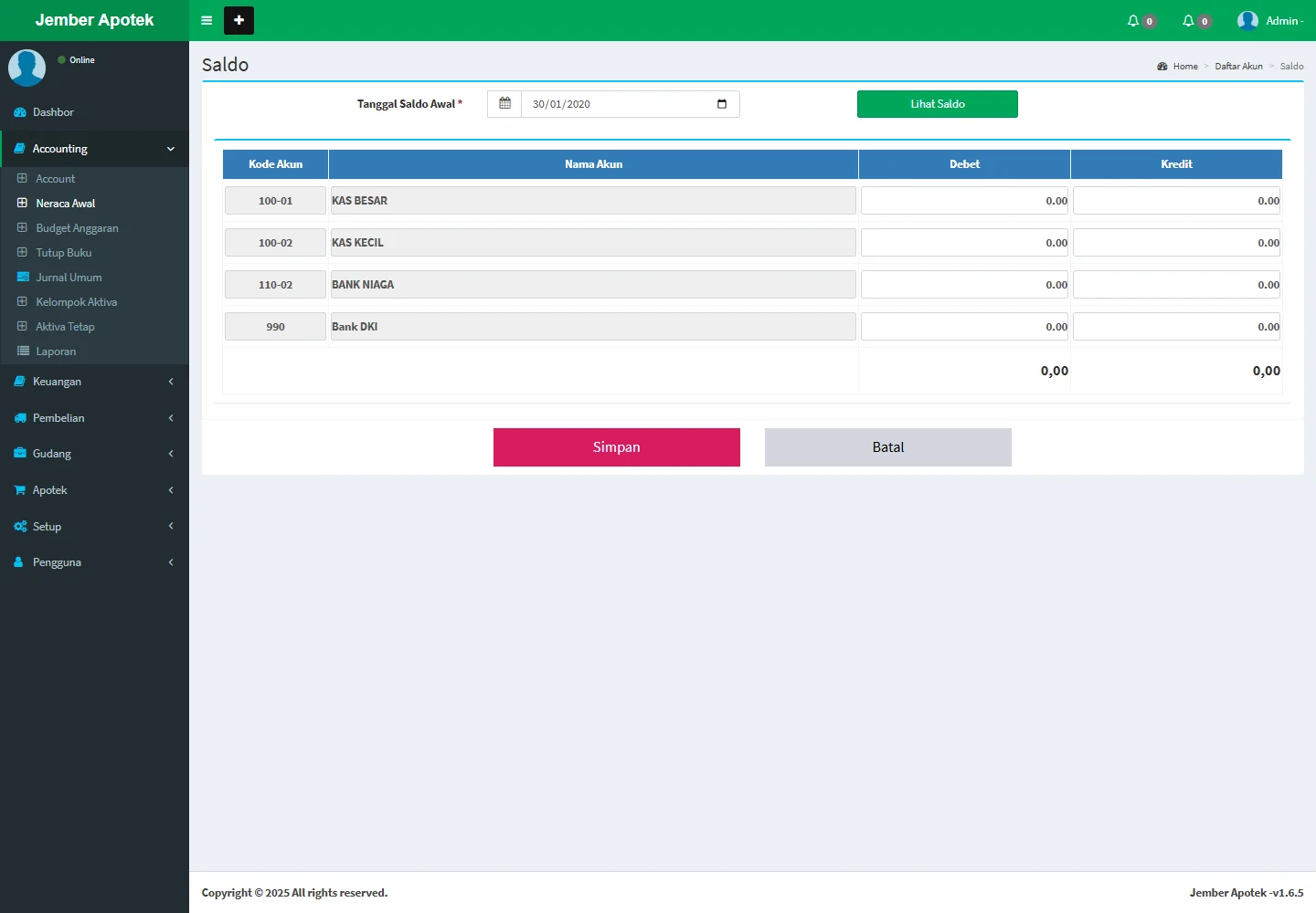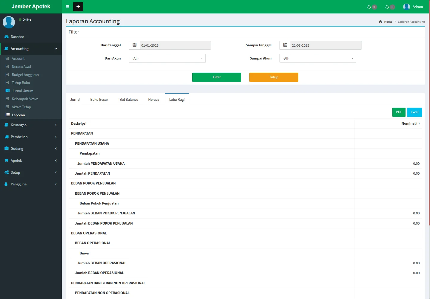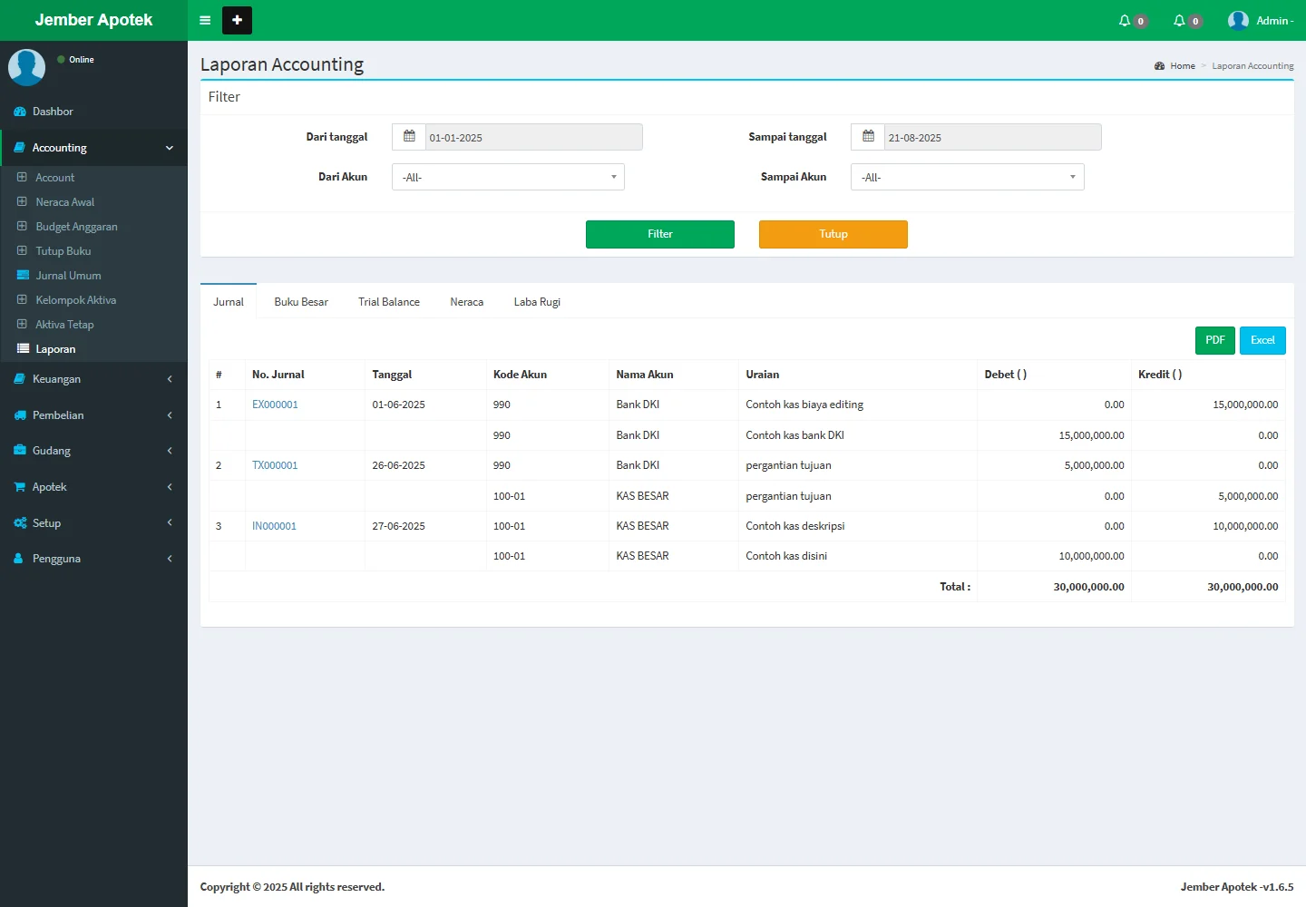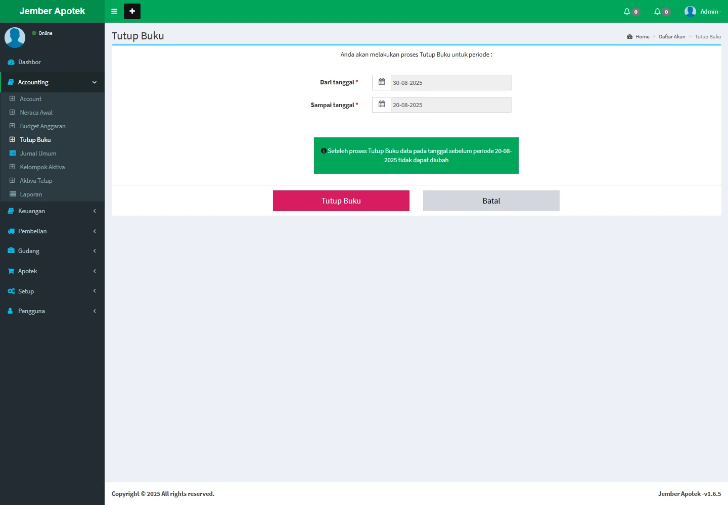 Kelola pembukuan lengkap mulai akun, neraca awal, anggaran, tutup buku, jurnal, aktiva tetap, hingga laporan keuangan Apotek.