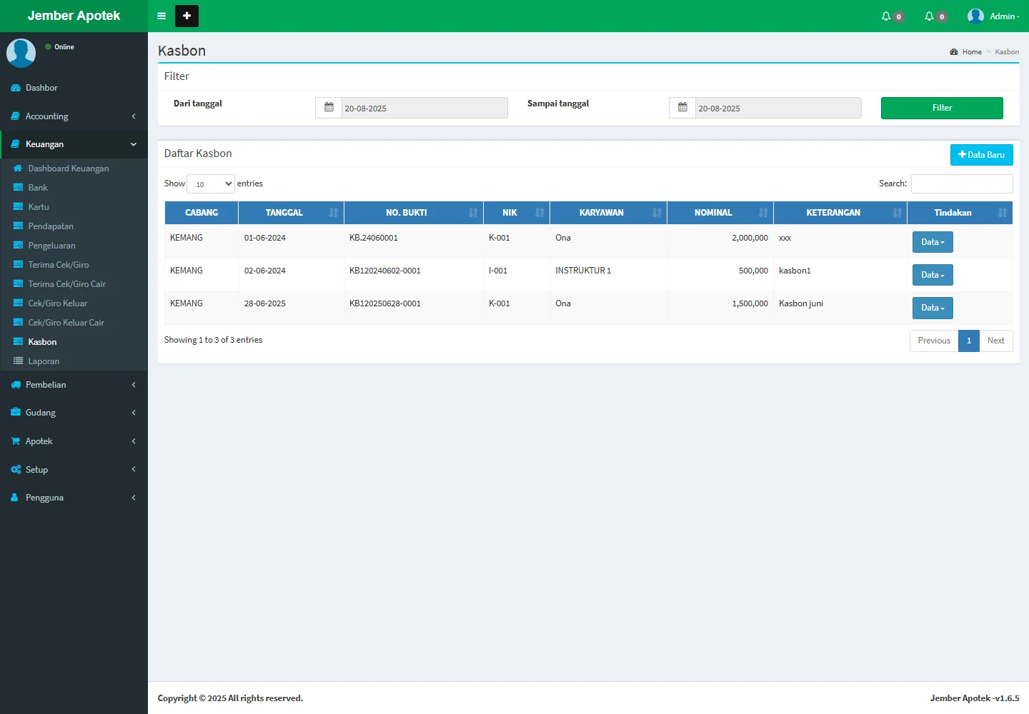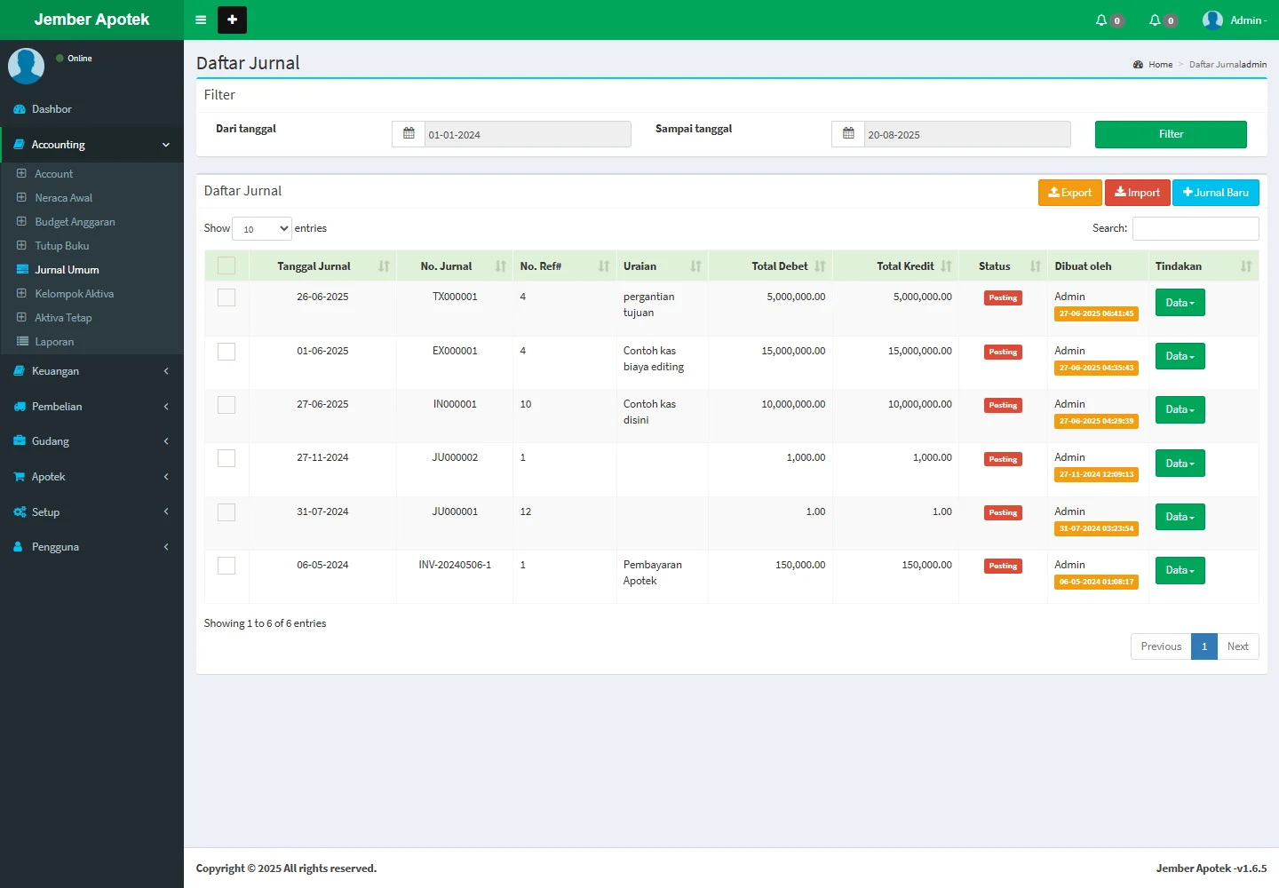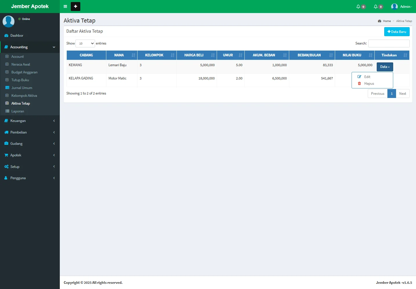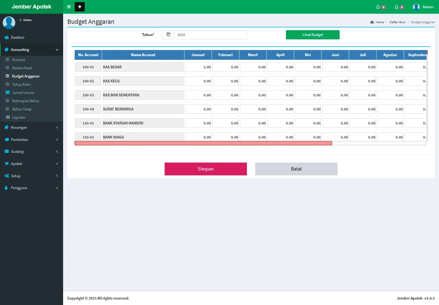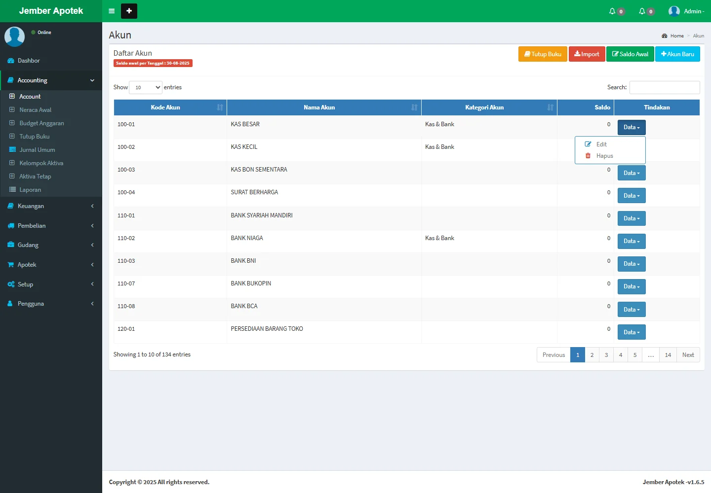 Kelola pembukuan lengkap mulai akun, neraca awal, anggaran, tutup buku, jurnal, aktiva tetap, hingga laporan keuangan Apotek.