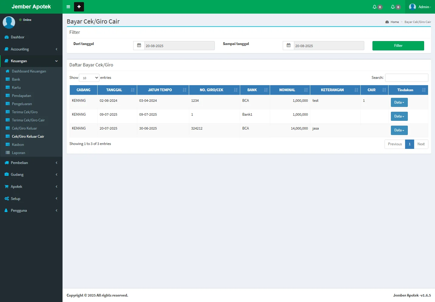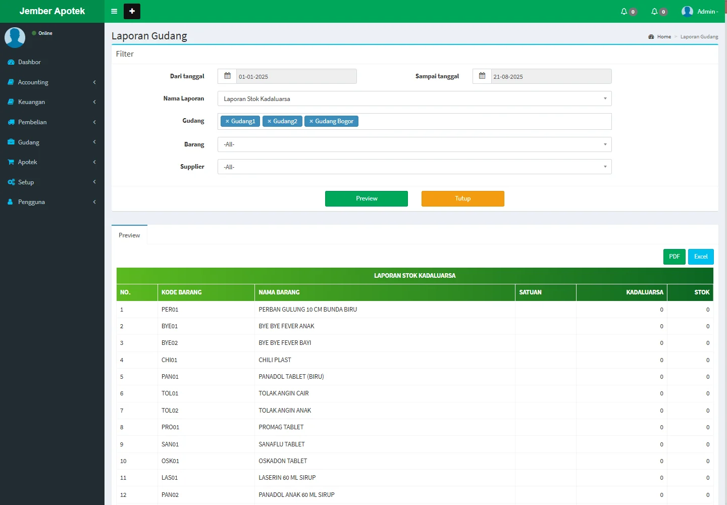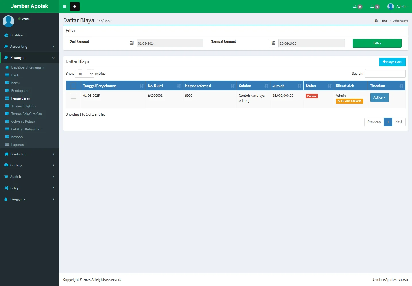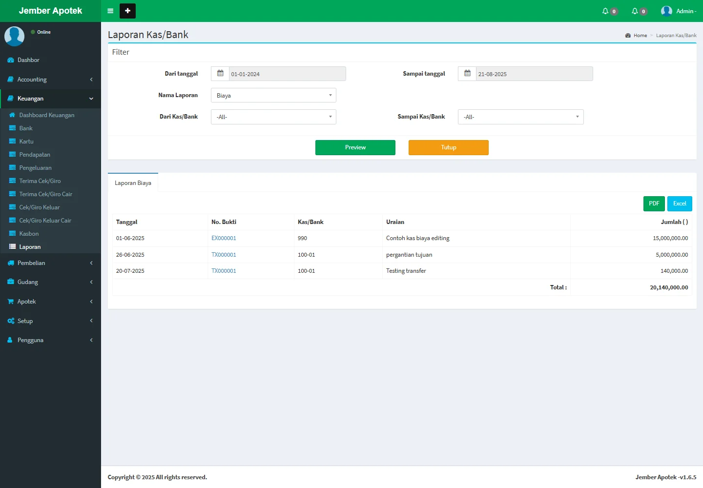 Menampilkan data semua pengeluaran apotek secara rinci, yang bisa diekspor ke PDF atau Excel.