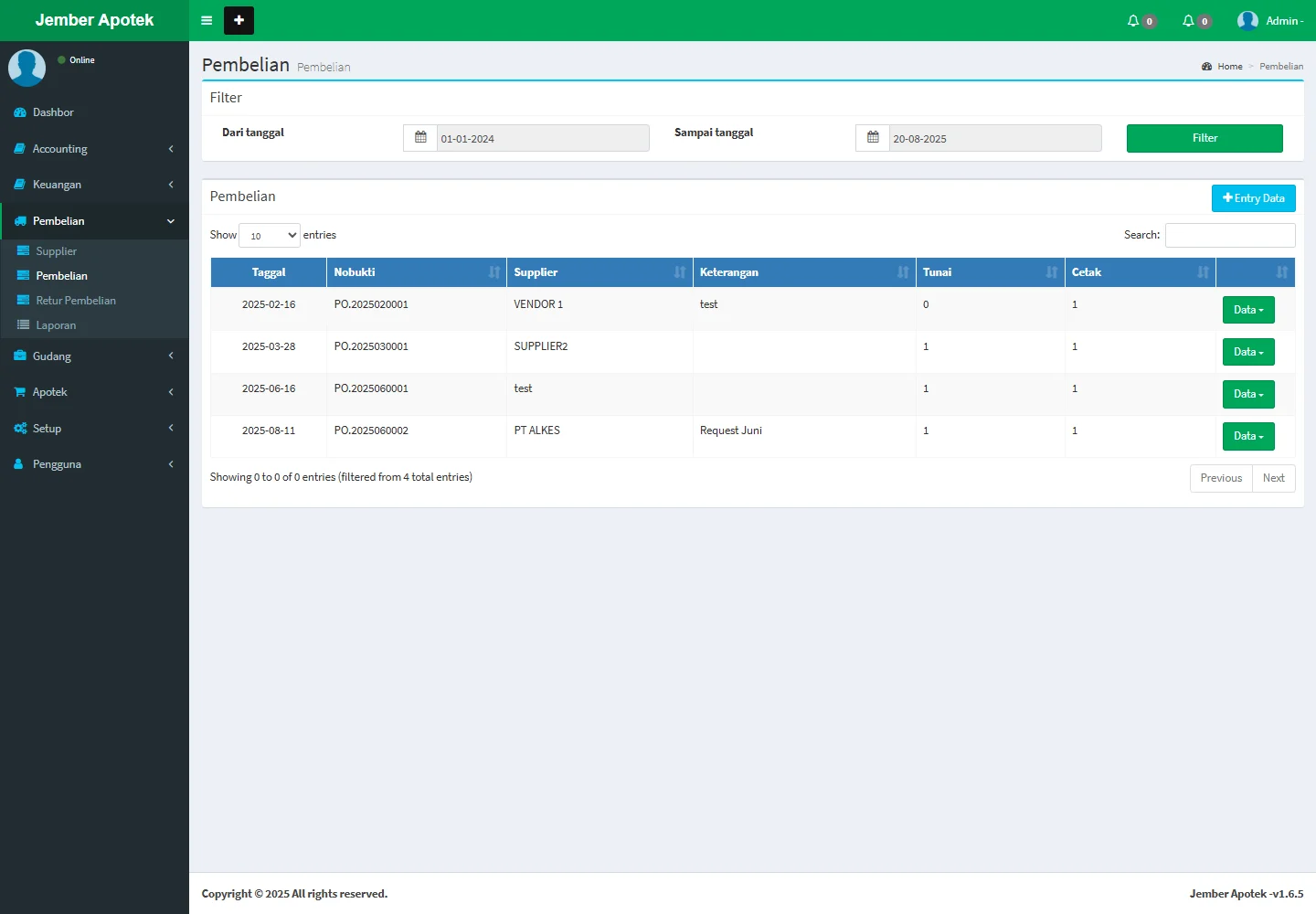Kelola supplier, proses pembelian obat, retur barang, dan laporan pembelian untuk kendali pengadaan dan stok.