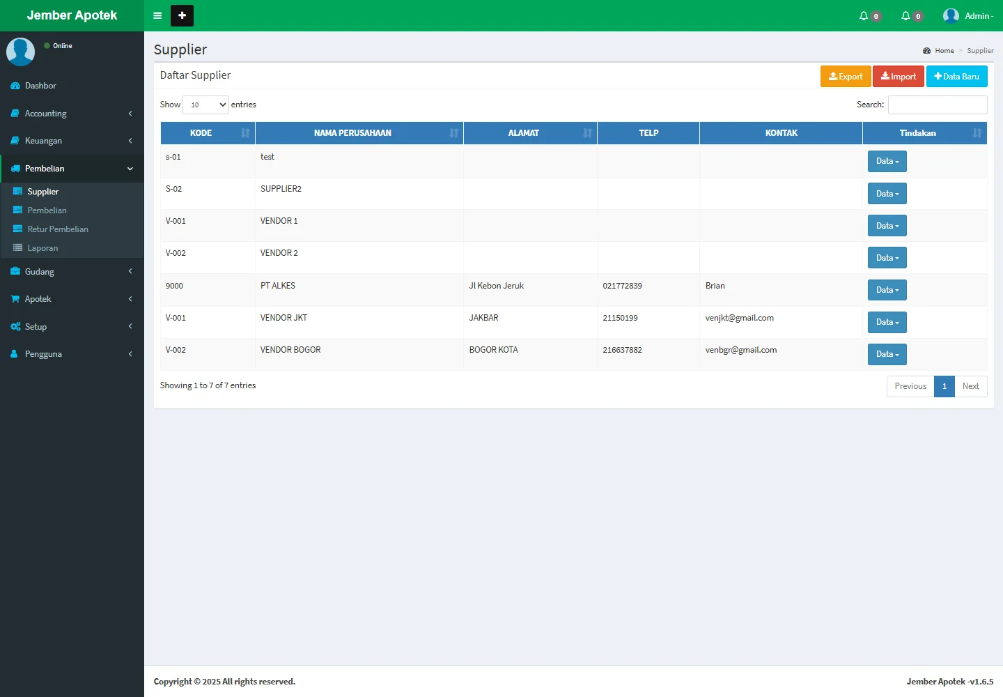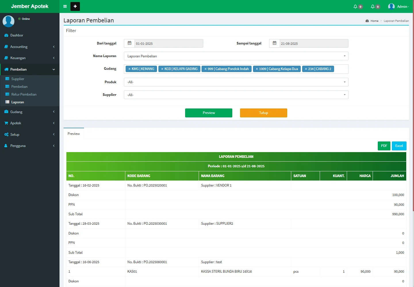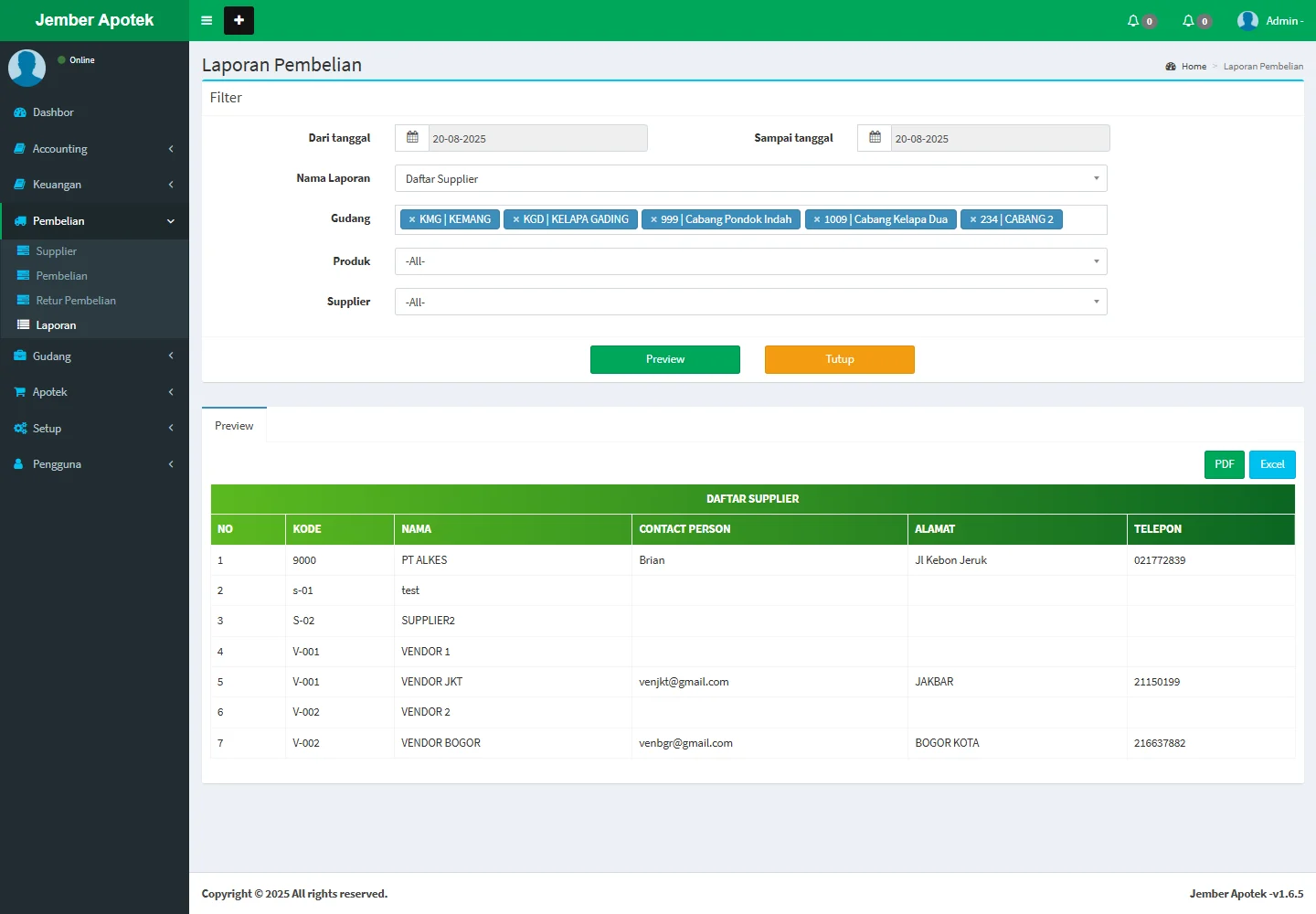 Menampilkan data lengkap daftar supplier yang bekerja sama dengan apotek, yang bisa diekspor ke PDF atau Excel.