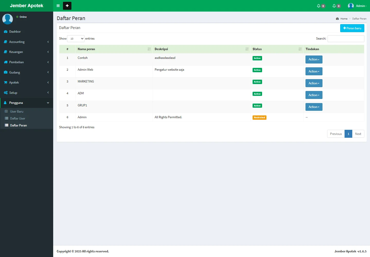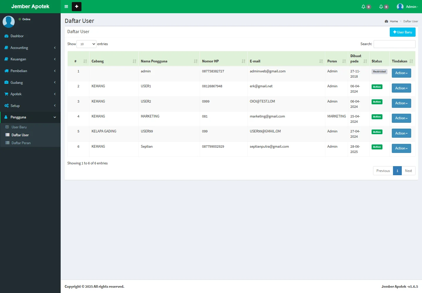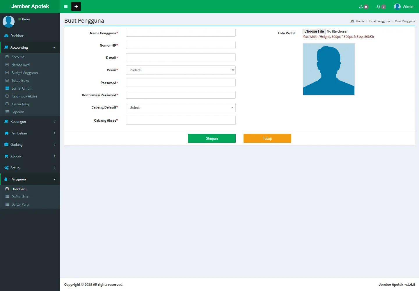 Kelola pengguna sistem, buat user baru, kelola daftar user, dan atur hak akses peran.