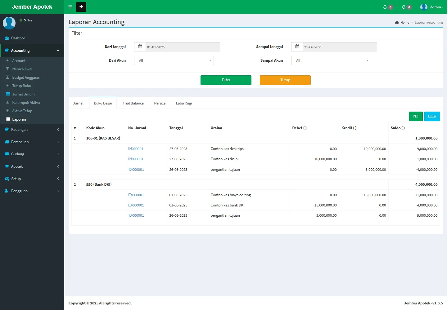 Menampilkan data laporan buku besar untuk setiap akun, bisa diekspor ke PDF/Excel.