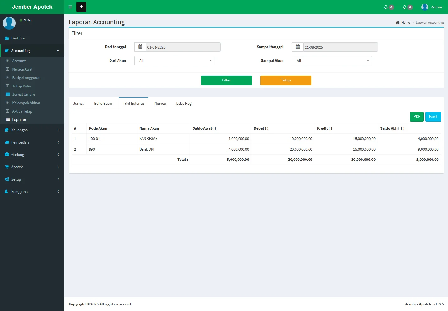 Menampilkan data laporan neraca saldo untuk cek keseimbangan akun, bisa diekspor ke PDF/Excel.