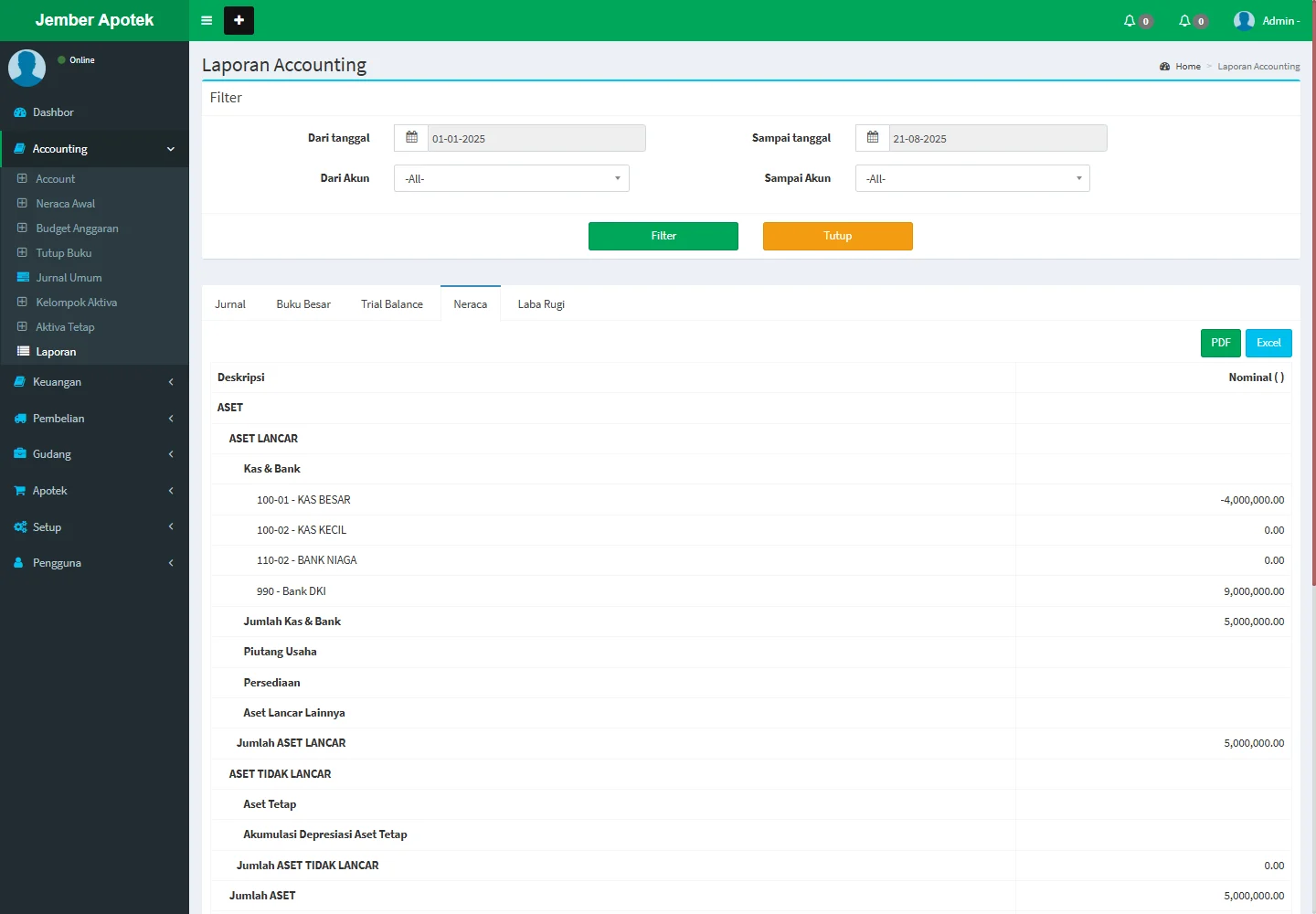 Menampilkan data laporan neraca keuangan secara keseluruhan, bisa diekspor ke PDF/Excel.