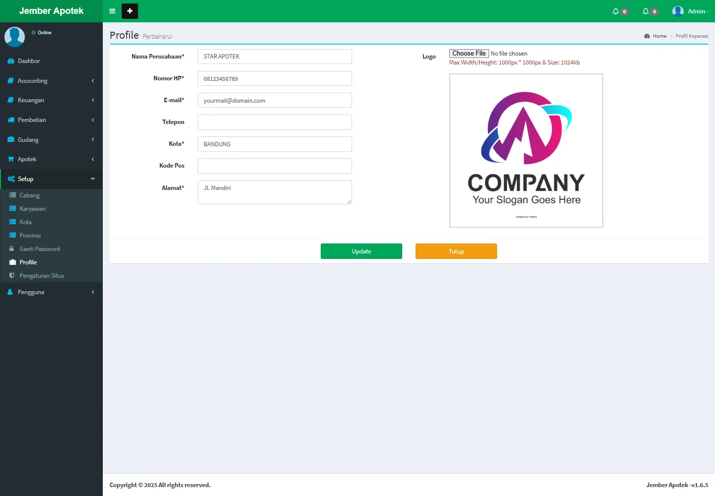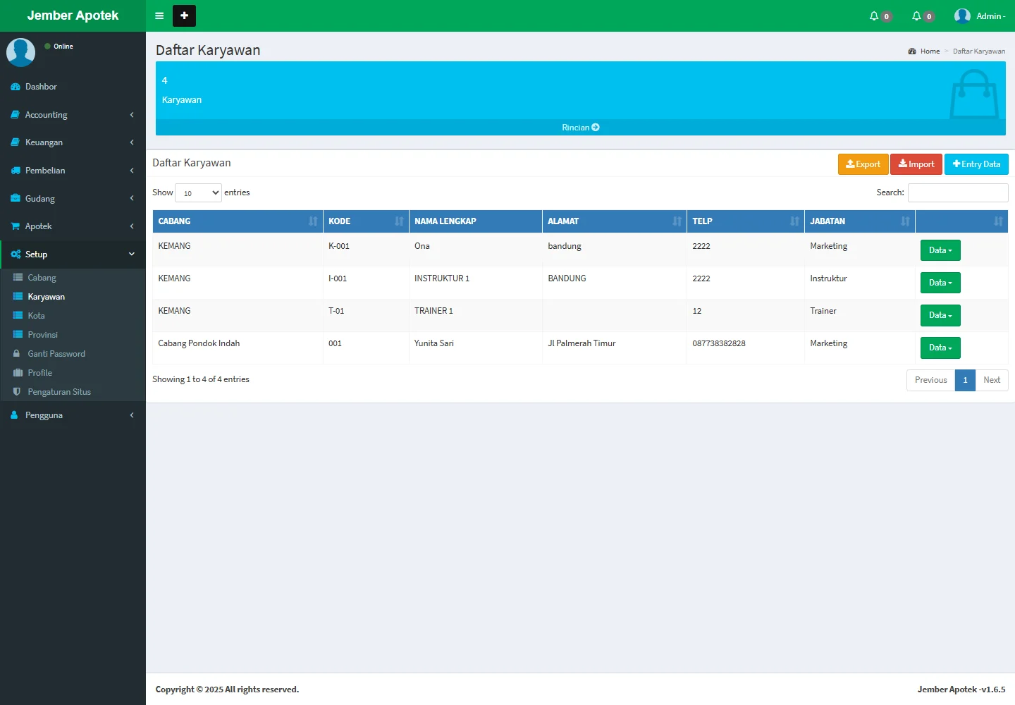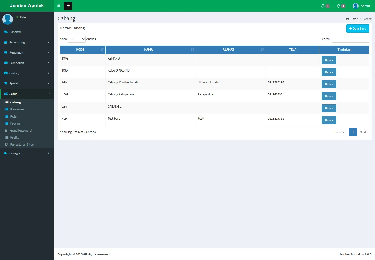 Pengaturan data cabang, karyawan, wilayah, keamanan, profil, dan konfigurasi aplikasi.