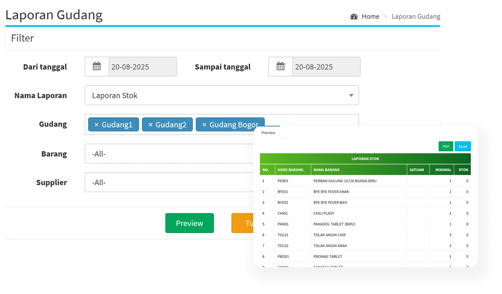 Menampilkan data laporan penjualan barang non-obat, bisa diekspor ke PDF/Excel.