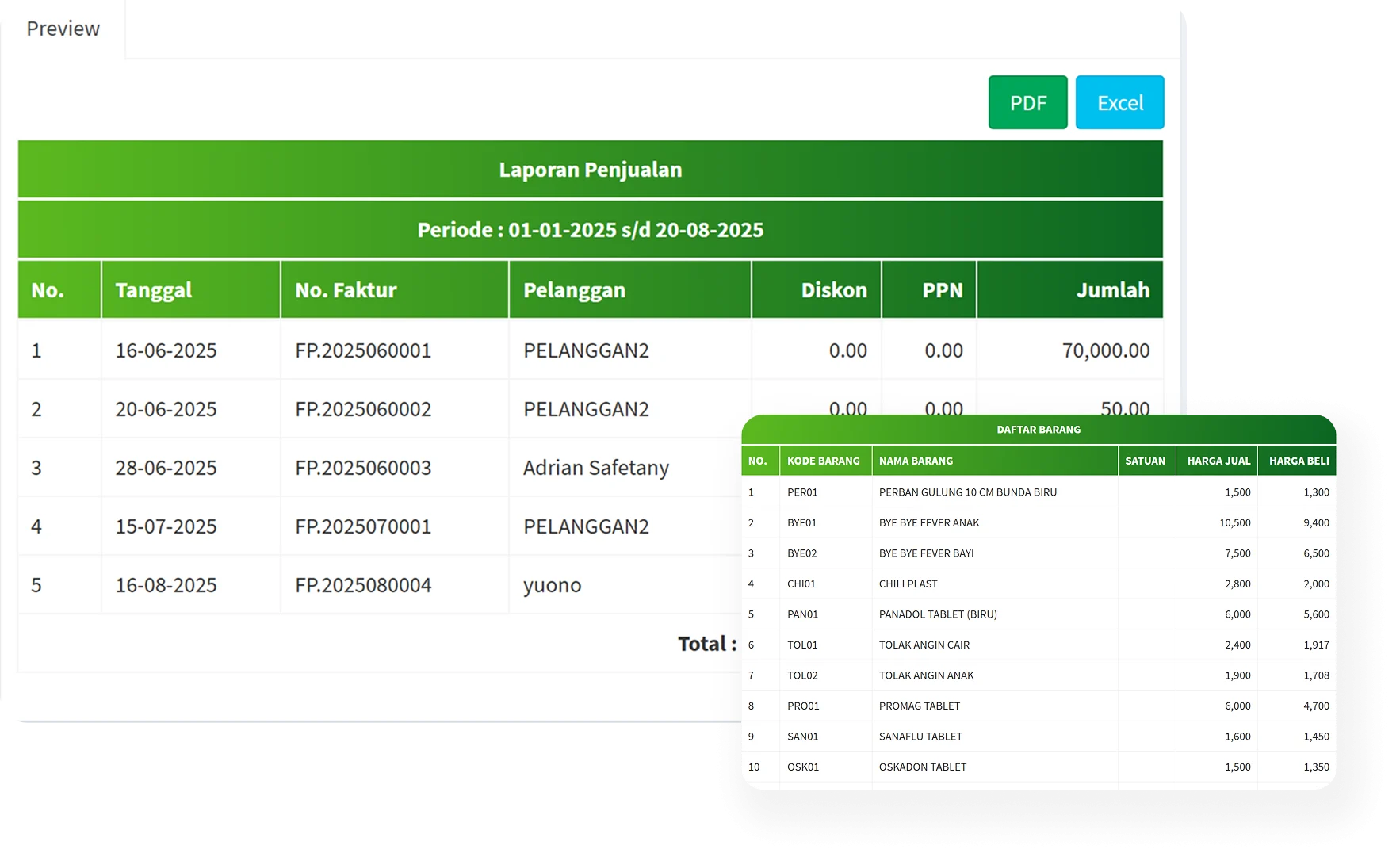 Menampilkan riwayat semua transaksi pembelian obat dan barang, yang bisa kamu ekspor ke PDF atau Excel.